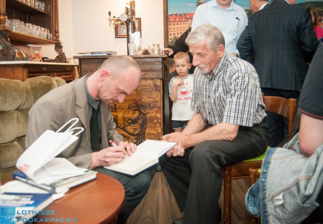 dwóch mężczyzn siedzi, jedne podpisuje książkę